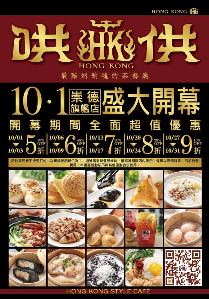 『哄供茶餐廳』崇德旗艦店於10/1盛大開幕,全台門市同步展開優惠活動,依據香港茶餐廳原汁原味的氣氛呈現,地道的粵語老歌、獨特的高椅背沙發卡位,彷彿親身體驗「真港情」的滋味!